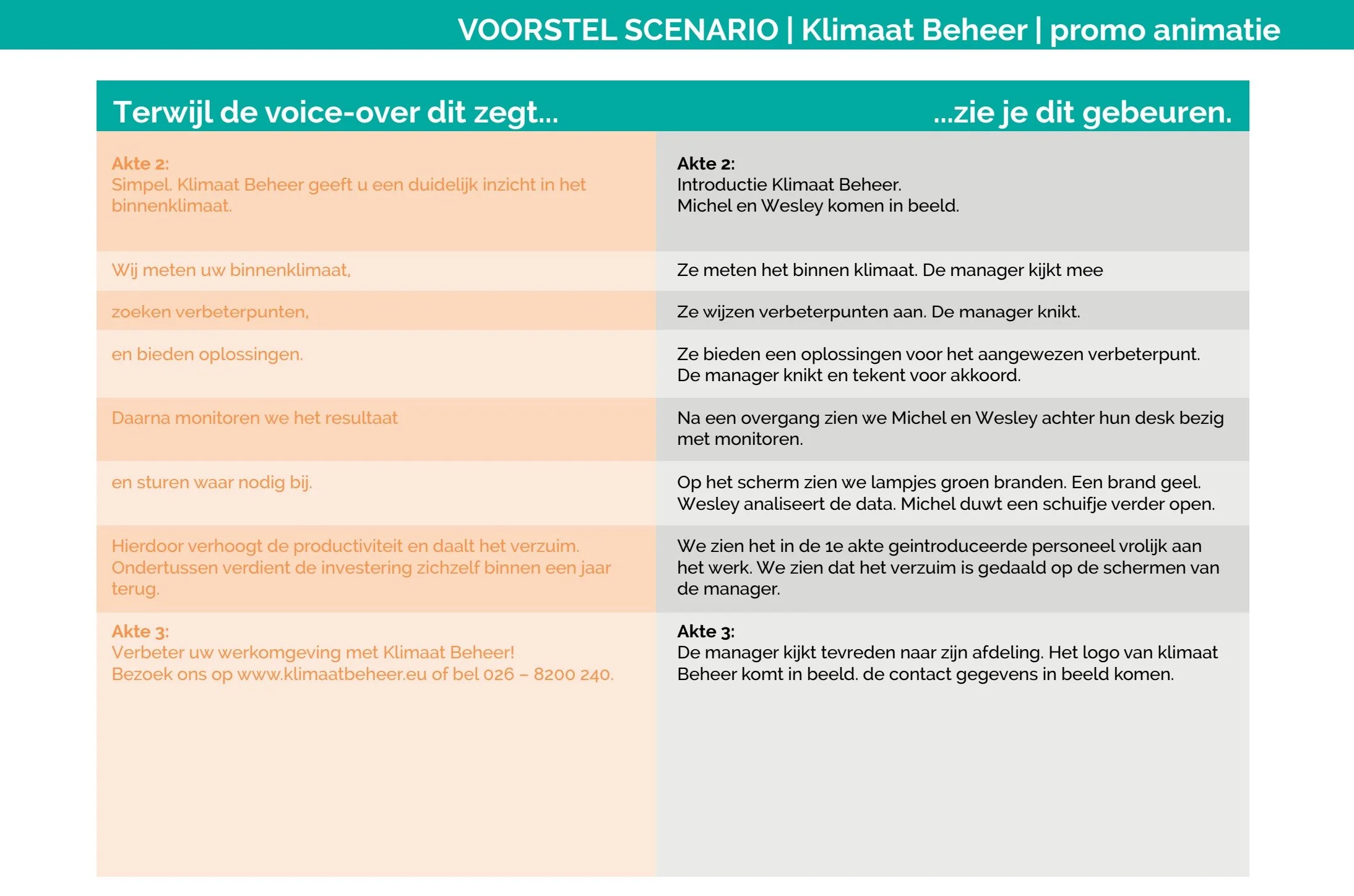 Als de voice-over tekst op slot is bedenken wat we in beeld zien gebeuren terwijl je de voice-over tekst hoort. We vertrekken vanuit een voor de doelgroep herkenbare situatie. Meestal vatten we in drie aktes het probleem, de oplossing en waar de doelgroep moet zijn in het script / scenario.